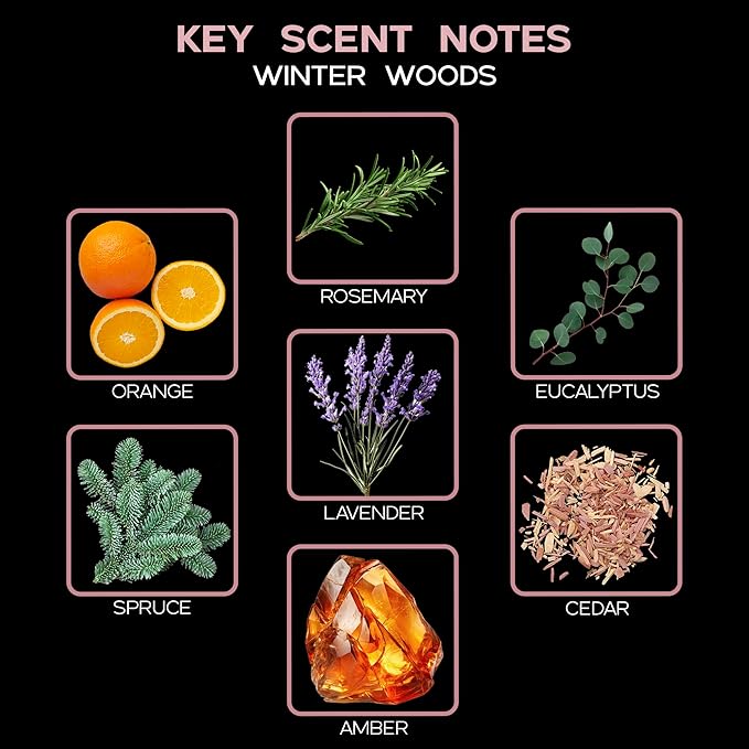 - WINTER WOODS – is a comforting 4oz diffuser oil refill featuring Orange, Rosemary, Eucalyptus, Spruce, Amber, and Cedarwood; evokes a brisk forest walk with cozy seasonal warmth