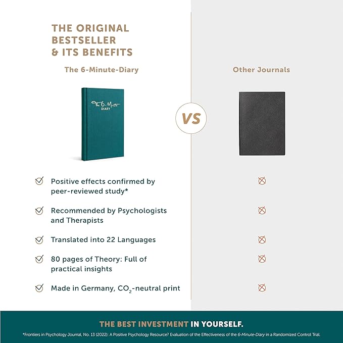 - ✅JOURNALING MADE EASY with Proven Techniques: Don’t know where to start? The 6 Minute Journal is the world's most beloved guided journal for a reason! All the journal prompts are backed by the proven principles of positive psychology. This undated self care journal allows you to begin whenever you’re ready!