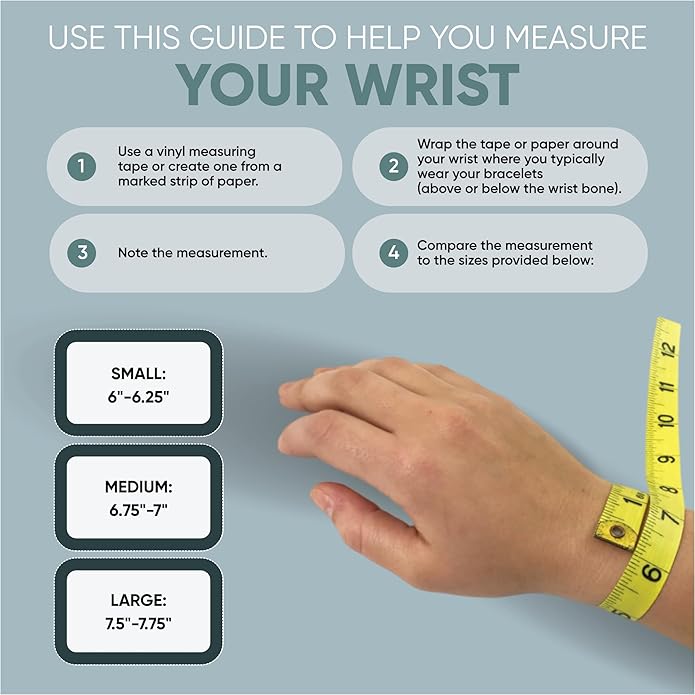 - UNISEX: Three sizes available: Small (6”-6.25”), Medium (6.75”-7”), and Large (7.5”-7.75”). Please measure your wrist at the point you like to wear your bracelets. If between sizes, size up or down depending on if you like your bracelets a little tight or loose. Please see the description below for an easy way to measure your wrist.