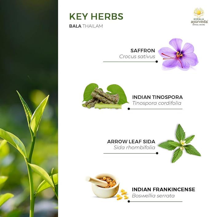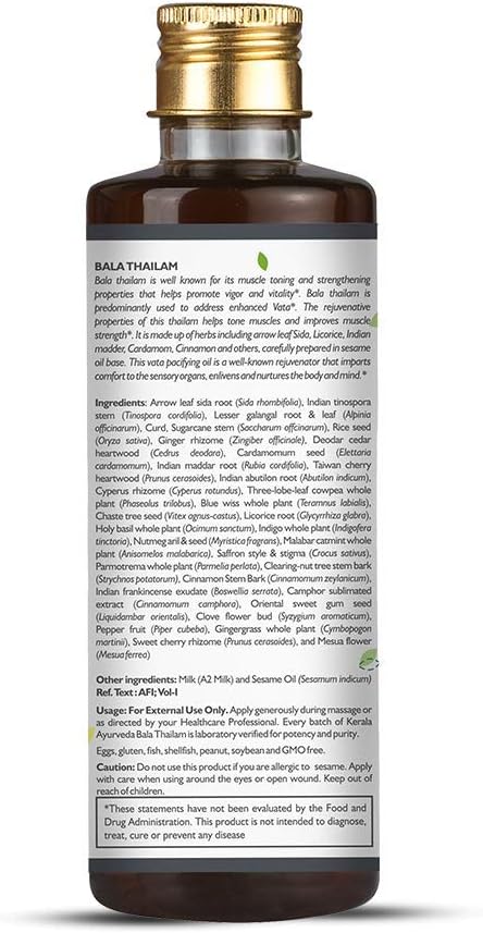 - Bala Thailam is a traditional oil well known for its support to help promote vigor and vitality. It is made up of herbs including arrow-leaf Sida, Licorice, Indian madder, Cardamom, Cinnamon and others, carefully prepared in sesame oil base.