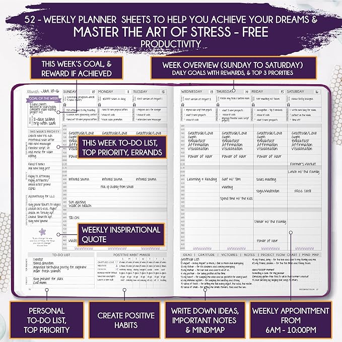 - INCREASE PRODUCTIVITY AND HAPPINESS - This is a deluxe life goal planner showing you how to become the best possible version of yourself on a mental, physical & interpersonal level using the law of attraction vibration guide. This planner is a daily planner, monthly planner, weekly planner, productivity planner, goal planner, business planner, to do list planner, planner notebook & gratitude journal all-in-one.