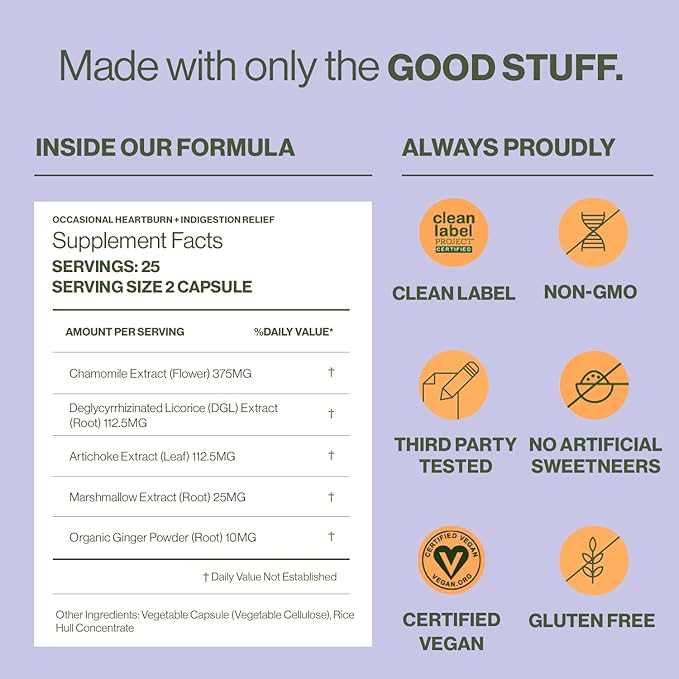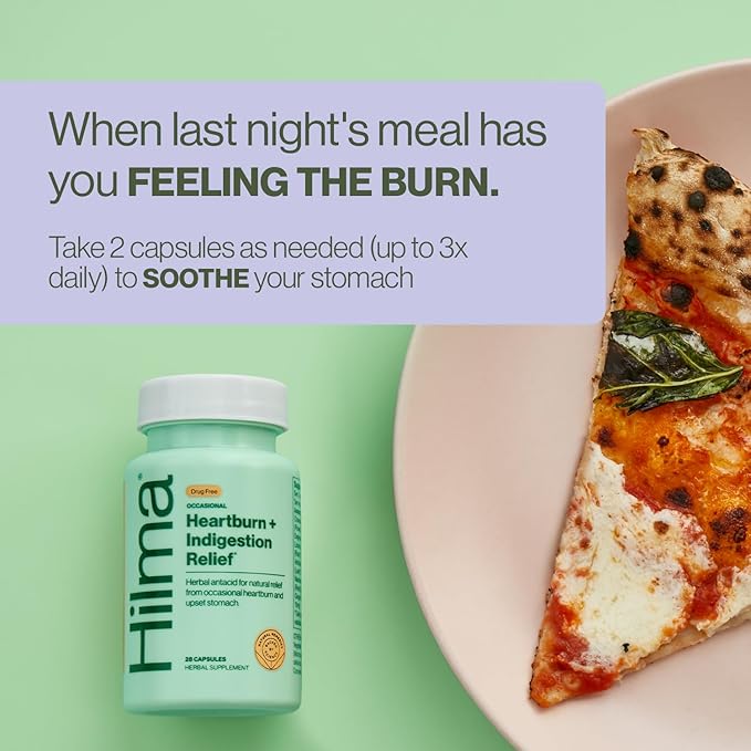 - Occasional Heartburn + Indigestion? - Get effective, drug-free relief. Hilma uses herbs that relieve occasional acid reflux + heartburn: Chamomile, Ginger, Marshmallow Root, DGL Licorice, Artichoke Leaf.* Ditch the chalky, sugary pills and syrups.