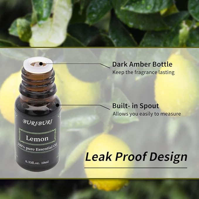 - Packing Includes: 10ml Lemon Essential Oil x1. With no adulterants or dilution, 100% pure quality. BURIBURI lemon oil is bottled in a durable amber glass bottle.