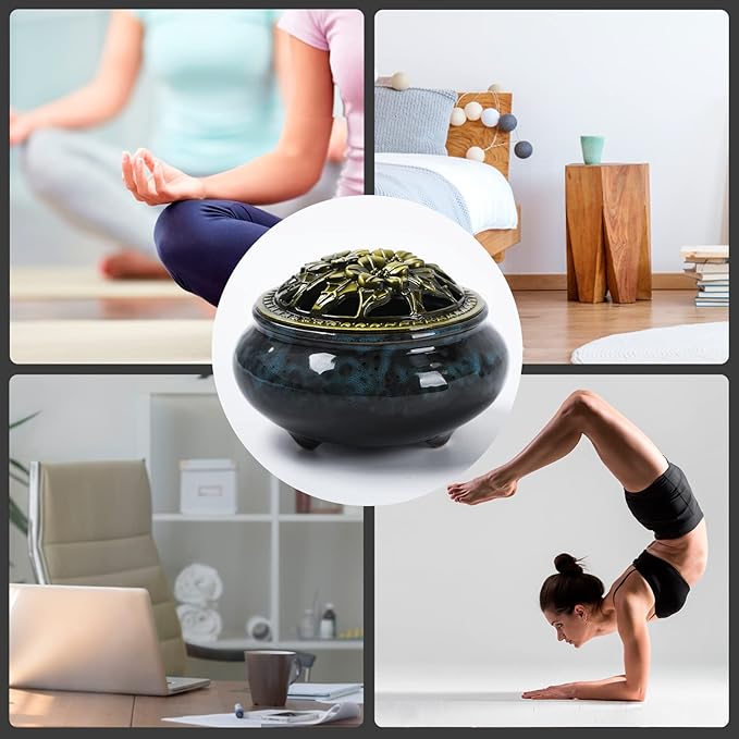 - 【Multifunctional Use】 Put incense holder or fireproof cotton in incense burner. Burn all kinds of sticks, cones, coils, resin,frankincense and palo santo, the smoke twists and twirls out of the floral lid, it creates a sense of mysterious atmosphere. It's perfect for carrying around, so you can easily store or move the position of the incense burner as needed.