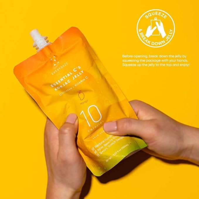 EVERYDAZE Essential C’s Konjac Jelly | Mango | Vegan Collagen Peptides and Vitamin C | Gluten Free, Sugar Free, Low Calorie | Healthy Drinkable Fruit Snack | 10 Pack Box Food Drink Pouch