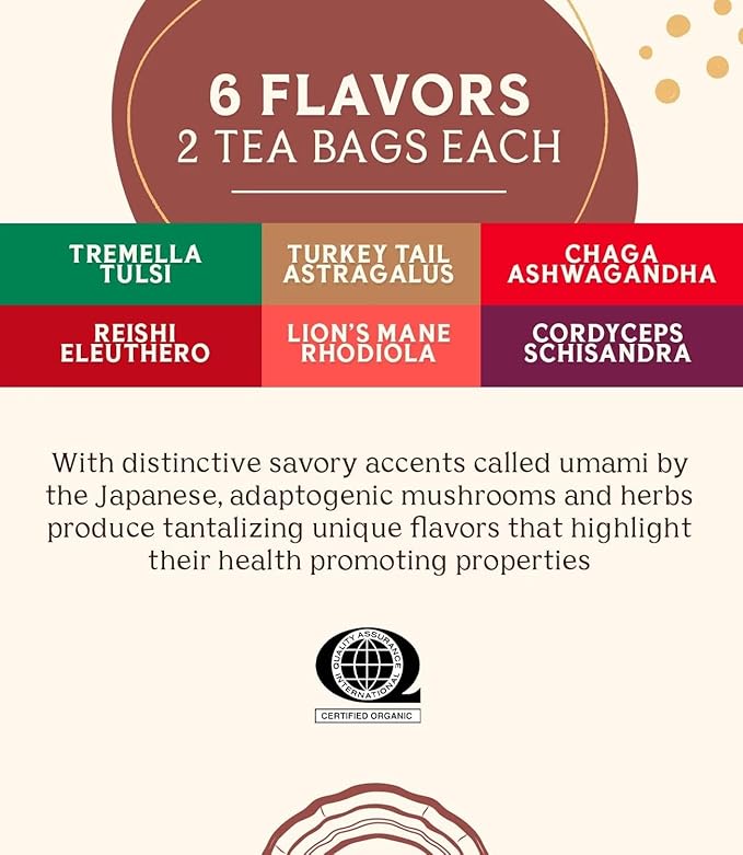 - ADAPTOGENIC HERBAL TEAS - Mushrooms are optimally paired with adaptogenic herbs to enhance their combined wellness benefits. Taste all 6 delicious mushroom teas to help your body adapt to all kinds of stress while fortifying your defenses and giving a boost to your endurance.