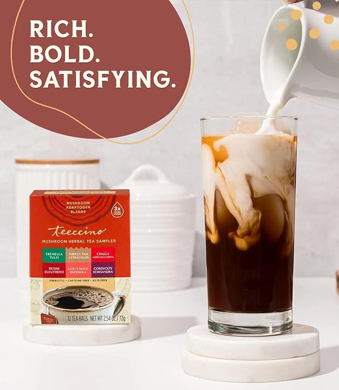 Teeccino Mushroom Herbal Tea - Mushroom Adaptogen Tea Sampler - 12 Tea Bags - Support Your Health With Mushrooms and Adaptogenic Herbs, Prebiotic, Caffeine Free, Acid Free