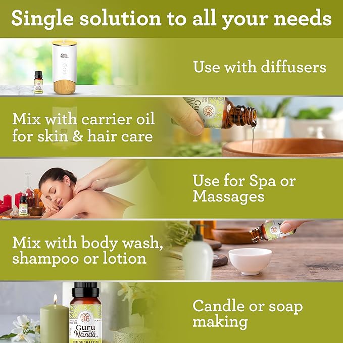 - Renew, revive, and revitalize with Lemongrass Essential Oil from GuruNanda. The stimulating, energizing, and cleansing essential oil with a citrusy, earthy aroma is perfect for aromatherapy.