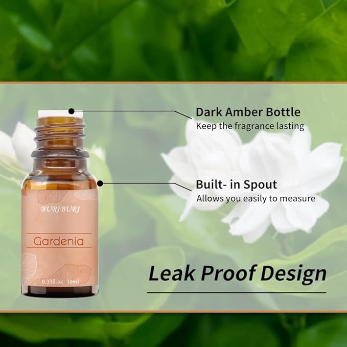 - Packing Includes: 10ml Gardenia Essential Oil x1. With no adulterants or dilution, 100% pure quality. BURIBURI gardenia oil is bottled in a durable amber glass bottle.