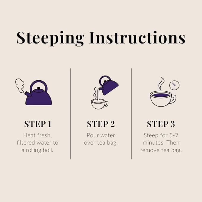 - STEEPING INSTRUCTIONS: Steeping herbal tea is easy. Simply heat fresh, filtered water to a rolling boil. Then pour water over tea and steep for 5-7 minutes if using a tea bag or full-leaf.