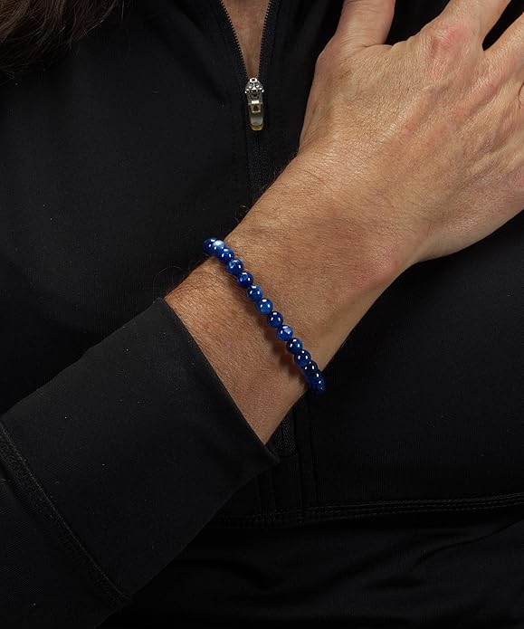 - CONTAINS: A blue kyanite bracelet made with 6mm semi-precious beads packaged inside a protective cloth drawstring pouch. Kyanite is an aluminosilicate mineral. It forms with long straight fibers which can be seen when cut into gems or beads. These beads are an amazing deep blue color. Heat stabilized to increase durability.