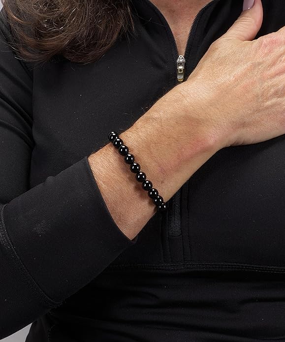 - CONTAINS: A black obsidian bracelet made with 8mm semi-precious beads packaged inside a protective cloth drawstring pouch. Black obsidian is a stone comprised of volcanic glass formed when lava cools quickly with minimal crystal growth