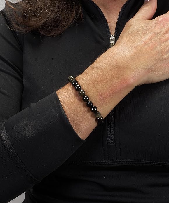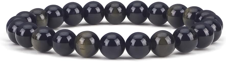 - CONTAINS: A golden obsidian bracelet made with 8mm semi-precious beads packaged inside a protective cloth drawstring pouch. Obsidian is a stone comprised of volcanic glass formed when lava cools quickly with minimal crystal growth