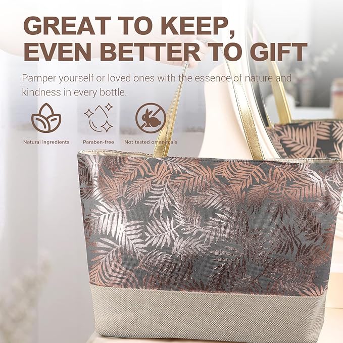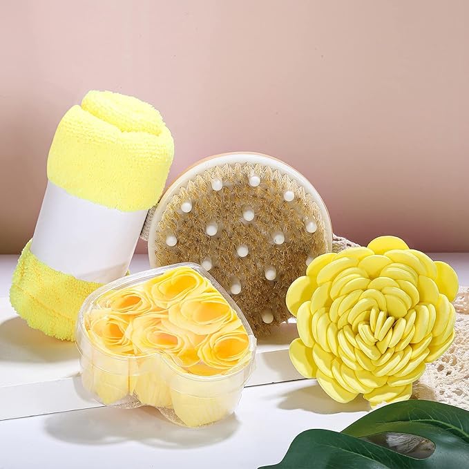 - š Come with essential oil, bubble bath, shower gel, hand cream, body lotion, body butter, bath bombs, bath salt, shampoo bar, pouf sponge, shower cap, bath brush and handmade tote bag.