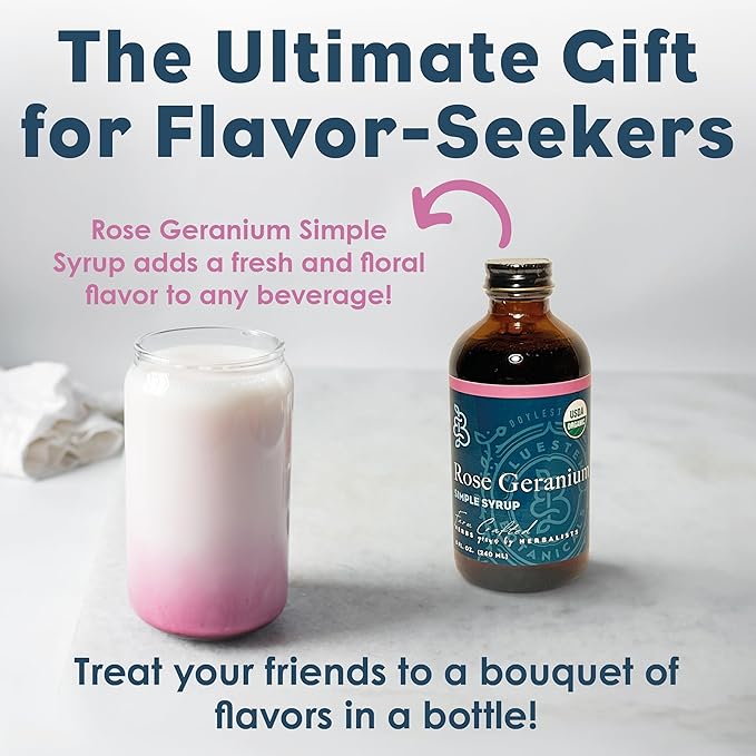 - ROSE GERANIUM SIMPLE SYRUP: From our garden to your glass, enjoy the perfect mixed drink, cocktail, or non-alcoholic beverage. Our high-quality, natural, and organic Rose Geranium Simple Syrup is the best addition to any bar, great for mixing up exciting new flavors that are sure to impress and connect people with joy and plants.