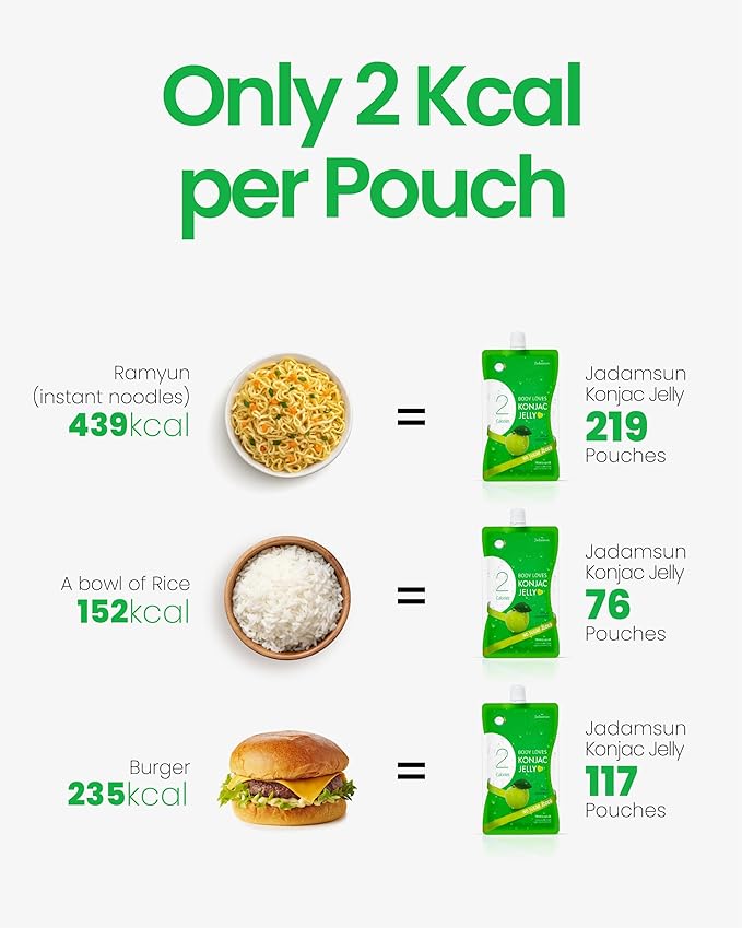 - JADAMSUN KONJAC JELLY JUICE (110g/3.7oz x 20 pcs) - Enjoy a guilt-free treat with our green apple-flavored konjac jelly juice, with only 2 kcal per pouch. This healthy, ultra-low-calorie snack is Korea's favorite, perfect for a balanced lifestyle. Each pack includes 10 convenient, individual pouches for on-the-go enjoyment.