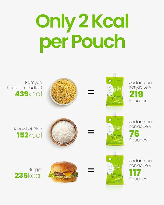 - JADAMSUN KONJAC JELLY JUICE (110g/3.7oz x 20 pcs) - Enjoy a guilt-free treat with our grape-flavored konjac jelly juice, with only 2 kcal per pouch. This healthy, ultra-low-calorie snack is Korea's favorite, perfect for a balanced lifestyle. Each pack includes 20 convenient, individual pouches for on-the-go enjoyment.