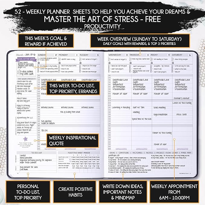 - INCREASE PRODUCTIVITY AND HAPPINESS - This is a deluxe life goal planner showing you how to become the best possible version of yourself on a mental, physical & interpersonal level using the law of attraction vibration guide. This planner is a daily planner, monthly planner, weekly planner, productivity planner, goal planner, business planner, to do list planner, planner notebook & gratitude journal all-in-one.
