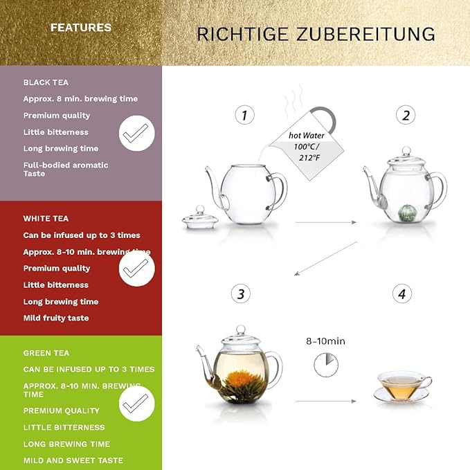 - FEATURES: Each Blooming Tea blossom can be poured up to 3x - and thus results in approx. 50oz (1.5l) tea each for true connoisseurs. The mild white tea is sweetly complemented by marigolds, peonies, jasmine blossoms and roses. Due to its high quality and low content of bitter substances, the tea tolerates long brewing times and guarantees an extended visual experience.