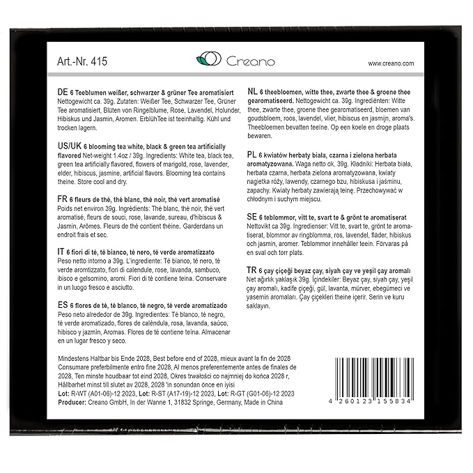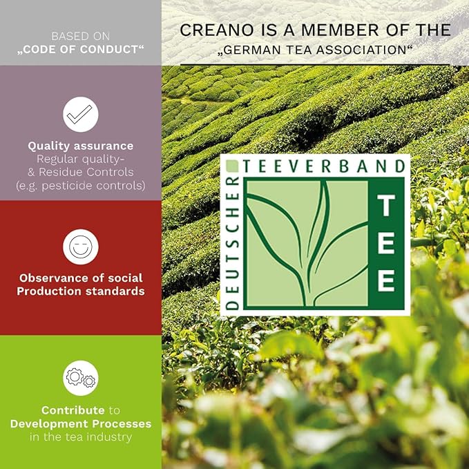 - QUALITY: Creano Blooming teas are a branded product of the very best quality. We attach great importance to the quality of the tea, blossoms as well as the function and appearance. As a member of the German Tea Association, we stand for the greatest possible product safety and are subject to the "Code of Conduct".