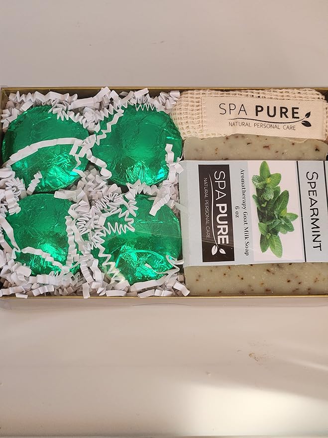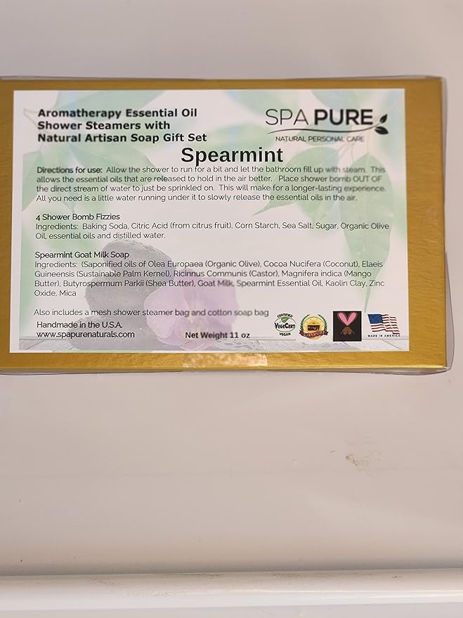 Spa Pure Aromatherapy Gift Set: Spearmint Artisan soap, 4 Shower Steamers, made in USA with plant based ingredients, Cotton Shower Steamer & Soap Bag