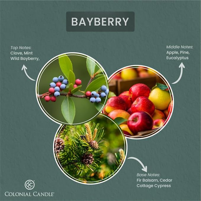 - FRAGRANCE | Top Notes: Clove, Wild Bayberry, Mint Middle Notes: Apple, Pine, Eucalyptus Base Notes: Fir Balsam, Cottage Cypress, Cedar