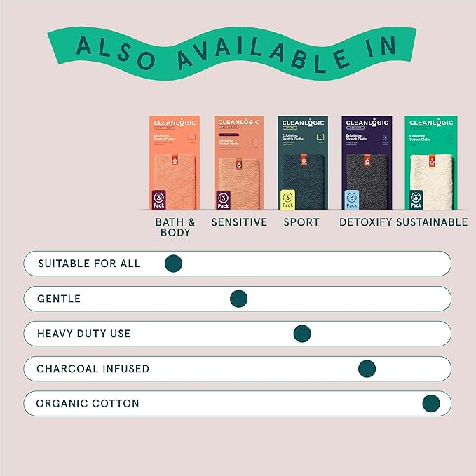Cleanlogic Body Exfoliating Cloth, Stretchy Organic Sustainable Cotton Exfoliator Bath and Shower Washcloths, Reusable Daily Skincare Tool, 3 Count