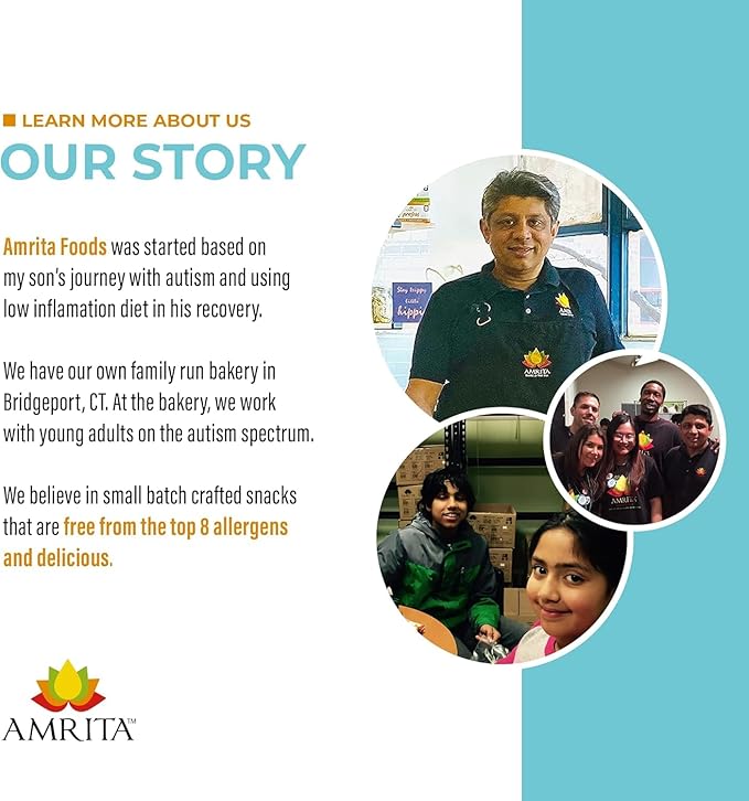 - The Amrita Promise - Enjoy our vegan snacks, crafted in small batches in our allergen-free family-run bakery. We proudly support young adults with autism through our hiring practices and stand by our products.