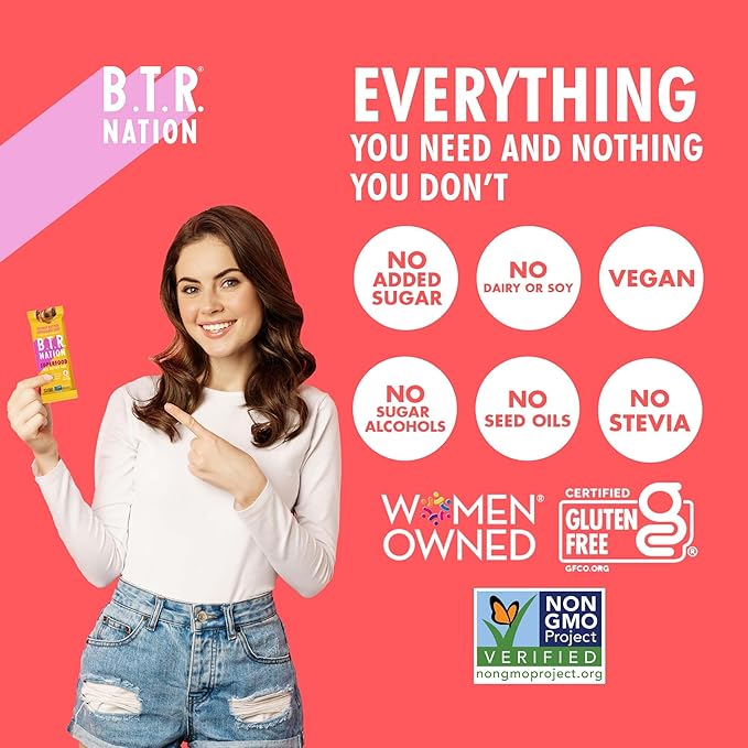 - ✅ NO JUNK, EVER. WE PROMISE: B.T.R. Bars are Non-GMO, Gluten-Free protein bars, Dairy-Free protein bars, and Soy-Free with a 100% Clean Label. No sugar alcohols, no stevia, no gums or emulsifiers, and no flavors (not even so-called “natural flavors”)
