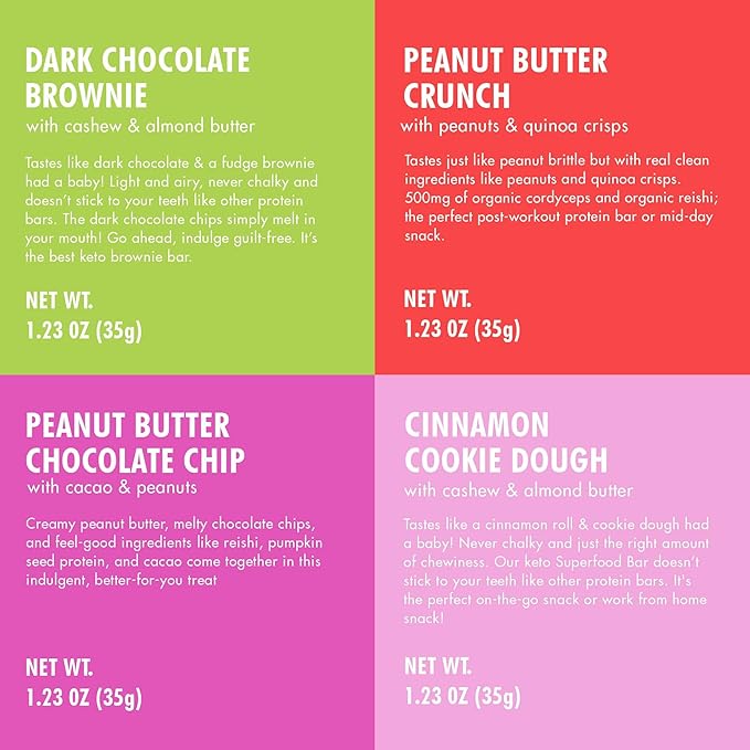 - ✅ VARIETY PACK: Want to try each of our bestselling superfood keto protein bars? Our Variety 12-pack gives you the best of both worlds: clean plant-based ingredients you trust, delicious flavors you crave!