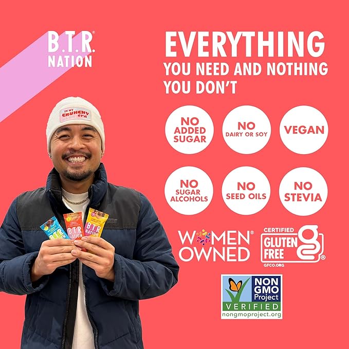 - ✅ NO JUNK, EVER. WE PROMISE: B.T.R. Bars are Non-GMO, Gluten-Free, Dairy-Free, and Soy-Free with a 100% Clean Label. No sugar alcohols, no stevia, no gums or emulsifiers, and no flavors (not even so-called “natural flavors”)