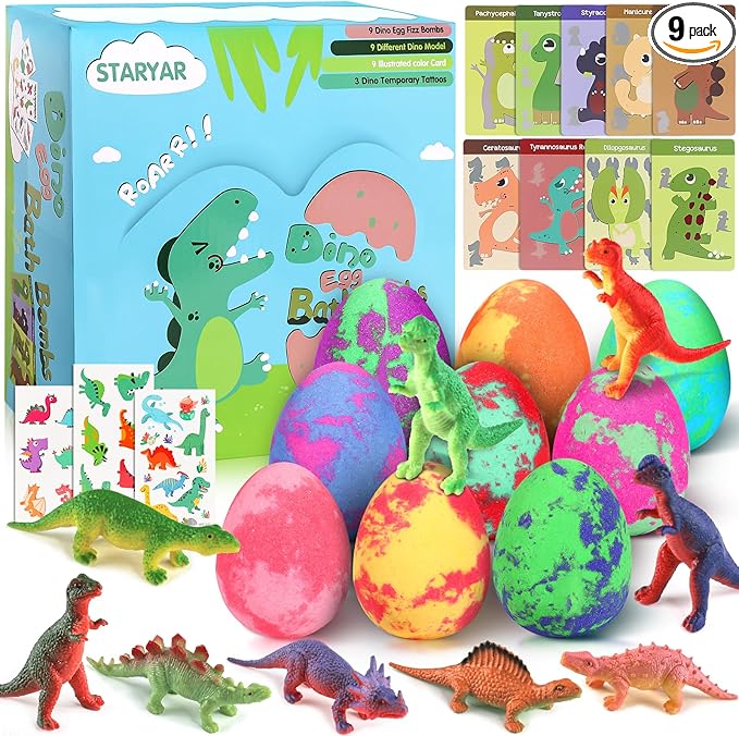 - 9 Colorful Dino Egg Bath Bombs Set: STARYAR kids bath bombs gifts set can be used as valentines day gifts for kids, include 9 colorful dino egg bath fizzies with different dinosaur inside, extra-large bath bombs and dino toys, valentines gifts for kids 3,4,5,6,7,8,9 Year.