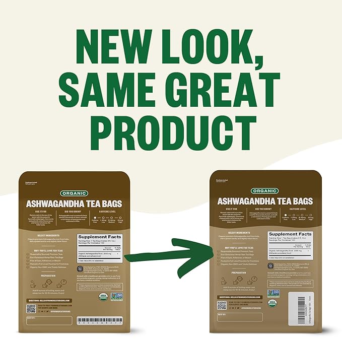 - ORGANIC ASHWAGANDHA TEA - The tea is filled into tea bags and packed into foil-lined kraft bags in California