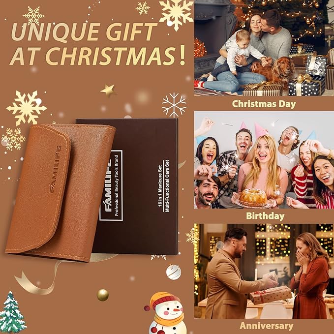 FAMILIFE Gifts for Men, Manicure Set Clippers Manicure Kit Nail Clipper Sets 16pcs Mens Grooming Kits Professional Stainless Steel Nail Kit Brown Leather Case Travel Kits