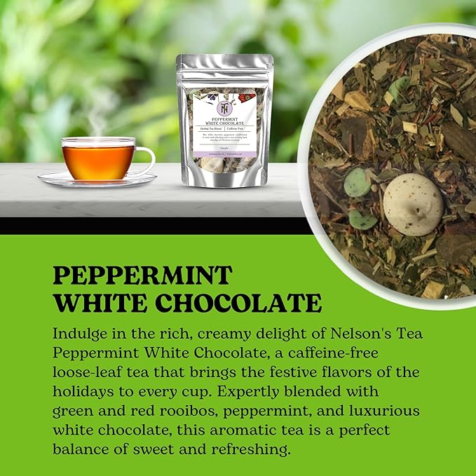Nelson's Tea - Peppermint White Chocolate - Caffeine Free - Loose Leaf Tea with Green & Red Rooibos - White Chocolate Peppermint Tea (Sample 0.4 Oz)