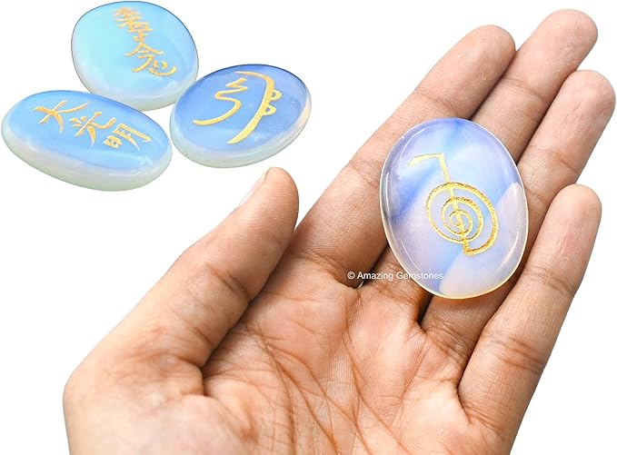 - This Opalite crystal reiki healing stone set with hand engraved golden usui reiki symbols contains 4 flat oval shape polished stones as shown in the picture.