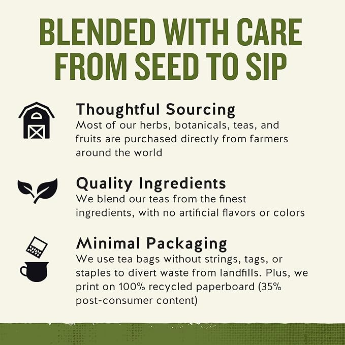 - MINIMAL PACKAGING: We use tea bags without strings, tags, or staples to divert waste from landfills. Plus, we print on 100% recycled paperboard (35% post-consumer content)