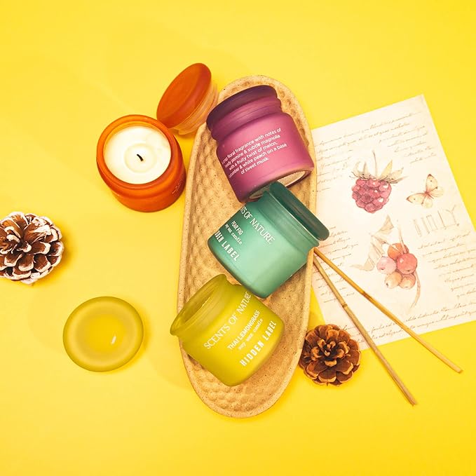 - - 【Small Candles with Cute Glass Jars】Our candle sets come with cute small candy-colored glass jars that add a touch of elegance to any room. The frosted glass provides an ideal balance between light and privacy, and each candle features a portable 3oz size that burns for 20-25 hours, making it perfect for use in the bathroom, while traveling, or in the office.
