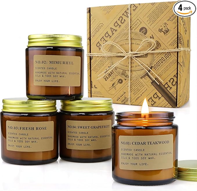 YFYTRE 4 Pack Scented Candle Set Soy Wax Candles, Aromatherapy Candles for Home Decoration, Jar Candles Gift for Women Mother with Amber Glass Jars and Kraft Wrapping