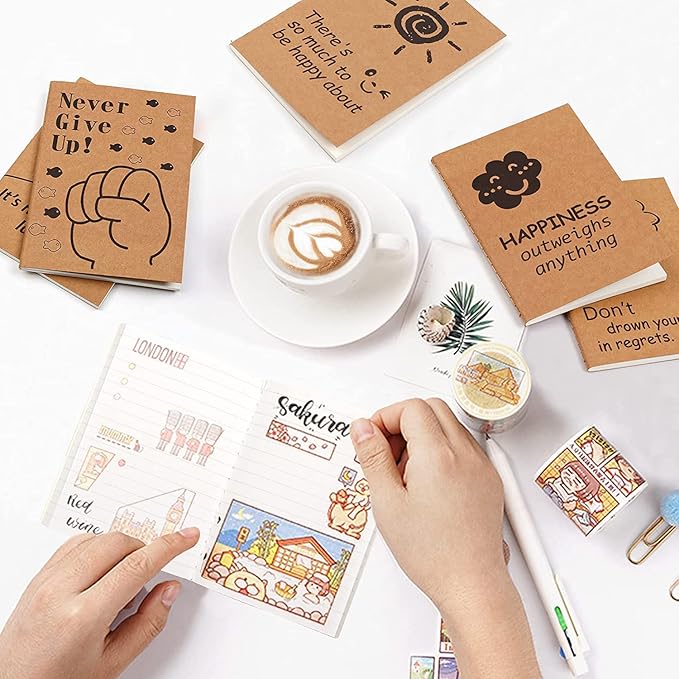 - 8 Different Designs Patterns on the cover are elaborately chosen. Every kraft notebook is printed with cute patterns and inspirational words. We hope that you feel motivated when you look at the notebook in your hand.