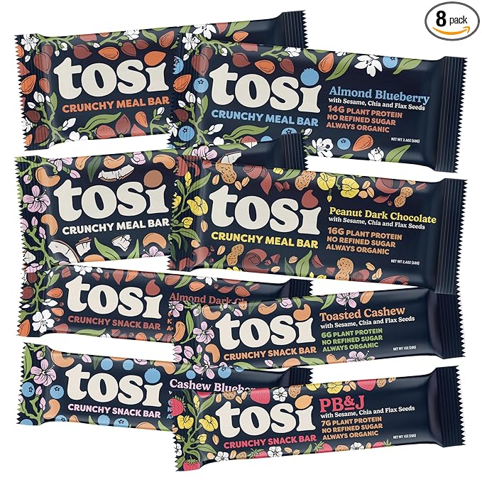Tosi Variety Pack Protein Bars, Plant Based with Nuts, Gluten-Free Crunchy Snacks, Vegan, Organic, Flax & Chia Seeds, Soy-Free, Omega 3s, 5G-20G Protein, 1 oz and 2.4 oz, 8-Pack