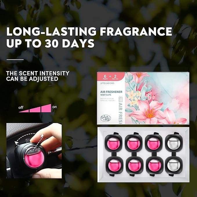 - Simple to Use: Clips easily onto car vents and stay firmly in place. Allows you to select the level of freshness intensity. Set of 8, each up to 30 days, total up to 240 days steady fragrance experience