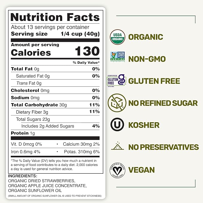 - Premium organic strawberries: Our certified organic strawberries are non-GMO, gluten-free, kosher, raw and vegan certified. Whatever your diet is, our gently dried strawberries will suit your needs.