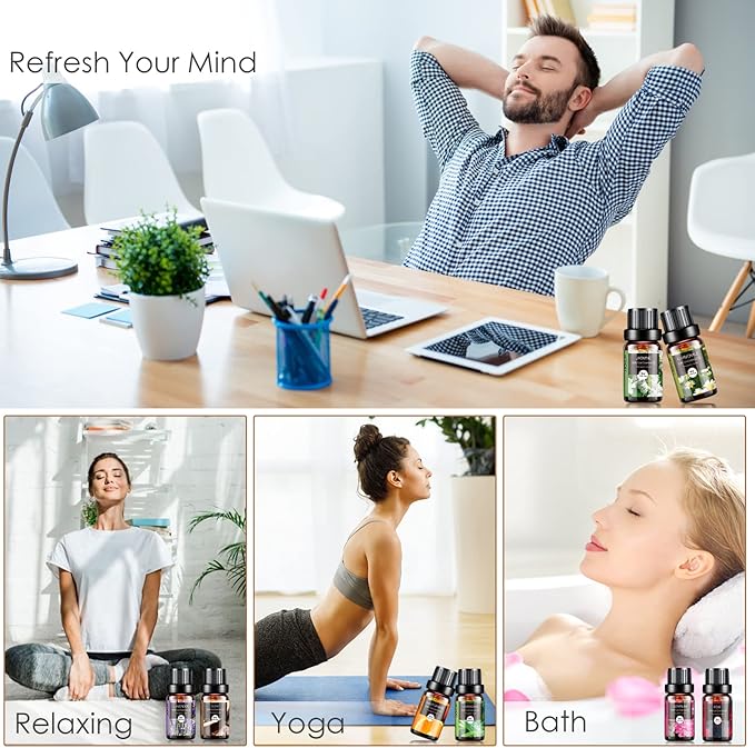 - 🎁Multi-Use: Our essential oils always adopt rigorous quality control standards. Simply add a few drops to any aromatherapy diffuser and fill your entire room with that aroma. And suitable for humidifier, aromatherapy, steam inhalations, hair or skin care, massage, bath, saunas, air freshening, home fragrance (bedroom, living room, bathroom, study room), office (workstation, conference room), yoga room and spa, etc.