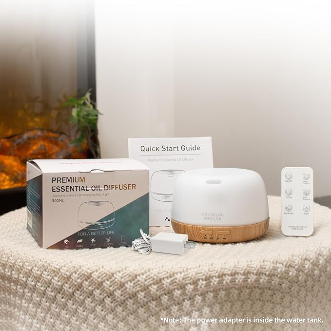 - Small, Compact But Powerful: ASAKUKI aromatherapy diffuser combines the benefits of aromatherapy and humidification in one compact device. Its classic and adorable design with 7-color light options makes it perfect for our bedroom use, with small 5.08"L x 5.08"W x 3.50"H size. The packaging includes a diffuser, USB-C cable, user manual, remote control, and a power adapter.