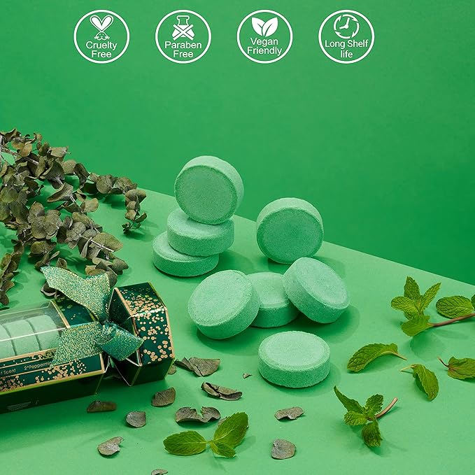 - BEDTIME RELAXATION & NASAL CONGESTION RELIEF: Infused with Essential Oils, Vitamin E & Shea Butter our Eucalyptus, Tea Tree, Spearmint & Peppermint Scents will give you a well-balanced relaxing night of well rest. Our Shower Tablets are 100% Cruelty & Paraben Free.