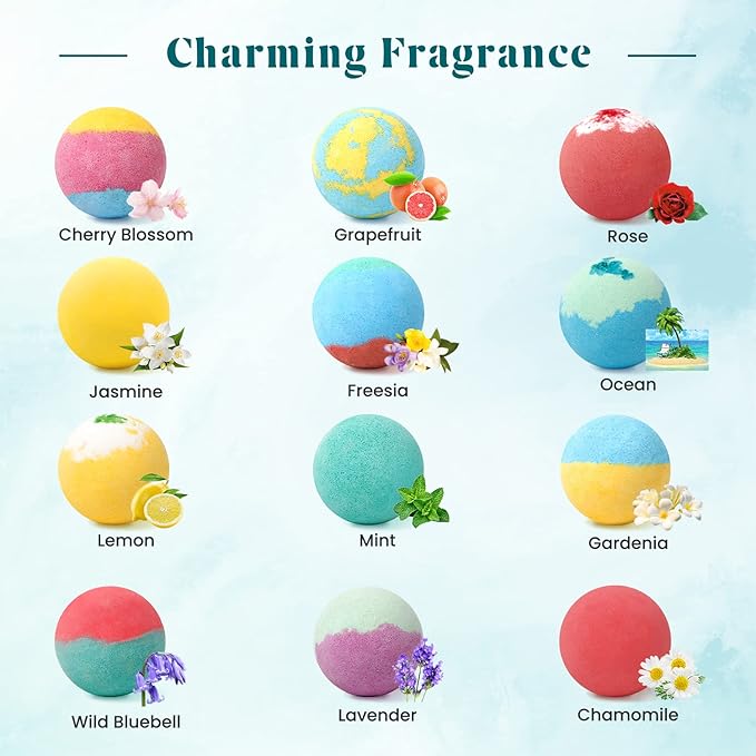 - [12 Fragrances] 12 bath bombs, each with a unique fragrance. Rose, jasmine, cherry blossom, lavender, mint, chamomile, etc. We have selected the most popular 12 fragrances to provide a varied and luxurious experience. Tired out after a long business trip? Use Zenbombs!