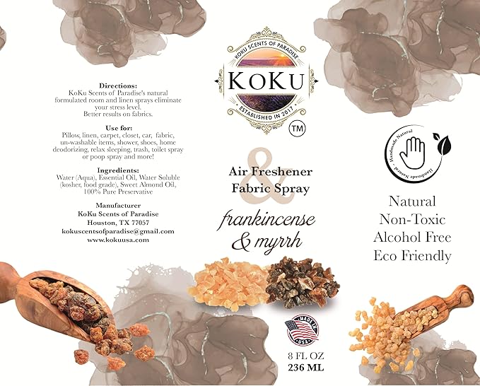 - Essential Oil Spray: Frankincense Myrrh air freshener with Frankincense Myrrh oil room spray that works to neutralizer odors safe with natural way. Healthful benefits of aromatherapy. Our air freshener spray is uses natural essential oils.