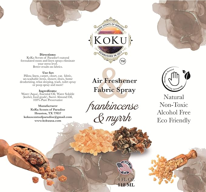 - Essential Oil Spray: Frankincense Myrrh air freshener with Frankincense Myrrh oil room spray that works to neutralizer odors safe with natural way. Healthful benefits of aromatherapy. Our air freshener spray is uses natural essential oils.