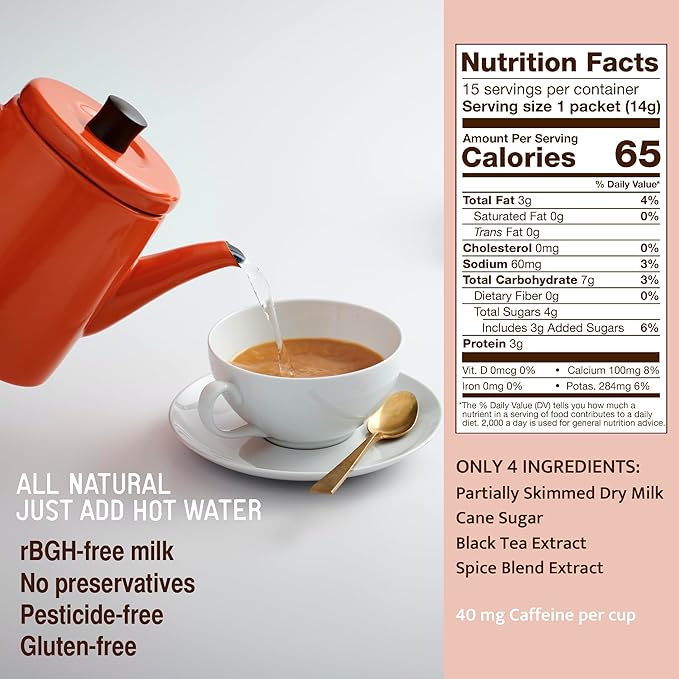 - ALL-NATURAL PREMIUM INGREDIENTS: Indulge in our commitment to purity with a blend that contains absolutely no preservatives or artificial additives. Every cup features only the finest natural components: premium black tea, quality dry milk powder for creamy texture, and a meticulously balanced blend of exotic spices. This clean formula delivers authentic taste without unnecessary additives.